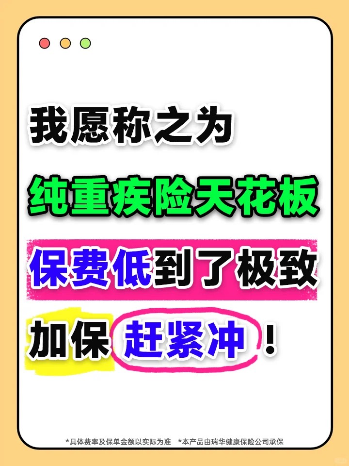 谁懂啊!对比了上百款重疾险熬了3个大夜,终于挖到宝了 预算有限又想保终身的姐妹直接锁死!这波加保福利我不允许你们错过!我愿称之为:纯重疾险天花板!保费低到了极致,加保赶紧冲!4大优势纯重疾里的性价比之